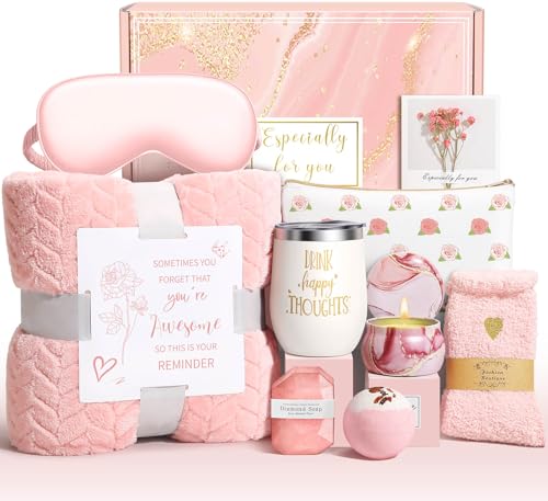 10-PIECE SELF CARE GIFTS FOR WOMEN -WORTHY TREASURES: Curated for gifting geniuses.”You’re Awesome” flannel blanket(with Inspirational words),12oz motivational tumbler (4hr hot or 8hr cold retention), 4Oz rose candle , bath bomb,Silk mask ,fuzzy socks, Rose diamond-shaped soap , dried flower gift card,Cosmetic bag.The ultimate spa gifts basket that keeps on giving.