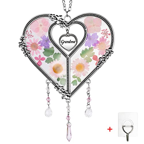 GUOER Heart Suncatcher with Pressed Flower Ornament Stained Glass Wind Chimes with Real Flowers,Birthday for Favorite Person (Grandma)