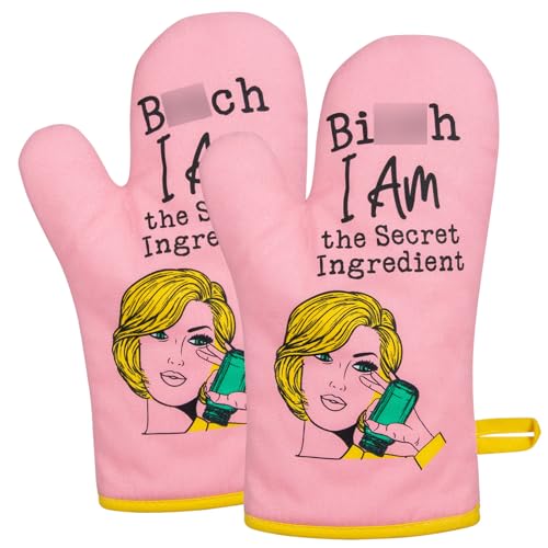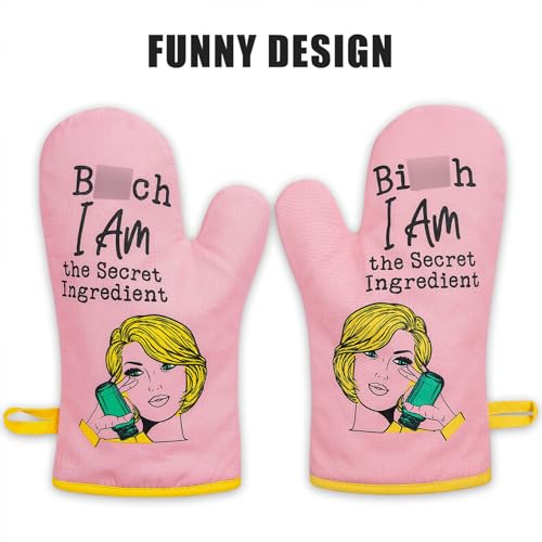 Funny oven mitts set of 2; Funny baking gifts for women who love to bake; Cute oven mitts for women, female chef, baking lover, cooking mom, mother in law, wife, grandma, daughter, sister, sister in law, best friend, BFF, bestie, neighbor, hostess, girlfriend, fiancee or any people who like to cook; Funny pink kitchen accessories for kitchen, funny cooking gifts, baker gifts for women