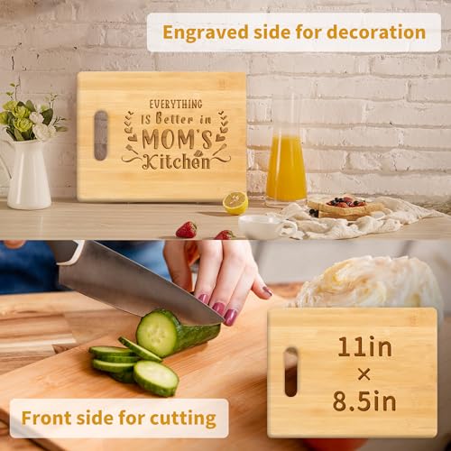 Ideal Size and Versatile Use:Measuring 11 x 8.5 inch with an ergonomic handle for easy grip and portability, this cutting board effortlessly handles bread, meats, fruits, and veggies.Its dual-sided design offers both practical functionality and decorative charm,let mom use it as a kitchen tool or display it as a stylish decor. A gift that adapts to her every need