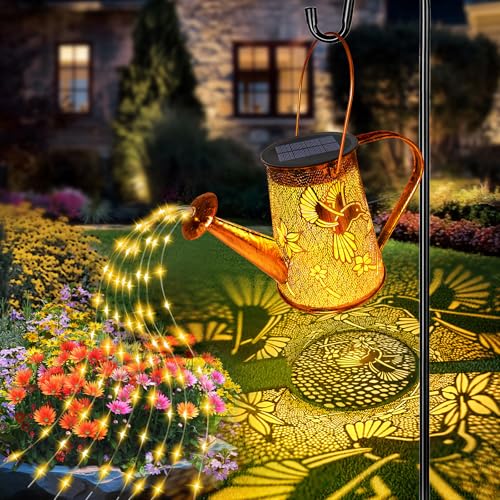Large Solar Watering Can With Lights: YJFWAL large solar garden lights (5.5 x 6.8 inches, with a 32-inch shepherd’s hook) comes with 10 strings of lights (80 LEDs) with LEDs in warm white flowing flashing lights that look like strings of glittering stars pouring out of the watering can. The hollow metal watering can projects a beautiful hummingbird pattern through the high intensity LEDs, creating a romantic atmosphere – ideal for decorating your patio, lawn or garden